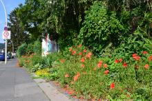 Direkt am Rheinweg nach der Bahnschranke haben Insektenfreunde ein buntes Blütenparadies auf kleinstem Raum angelegt. Eine wohlkombinierter Mischung aus Frühblühern, einjährigen Pflanzen und mehrjährigen Stauden bietet durch das Jahr einen reich gedeckten Tisch, auf dem Bild sieht man Mohn, Königskerze, Dost, Fette Henne und vieles mehr. Wer nach guten Ideen sucht, sollte hier vorbeifahren